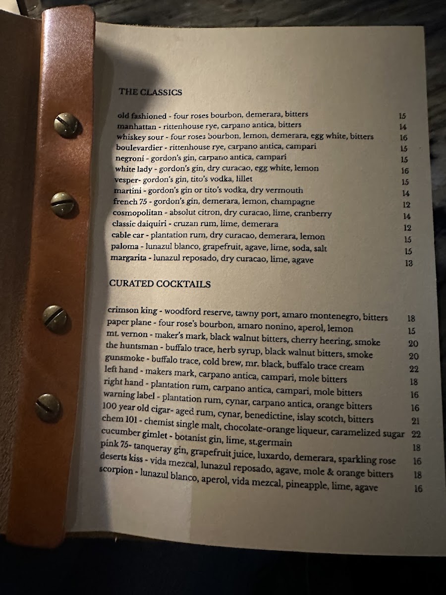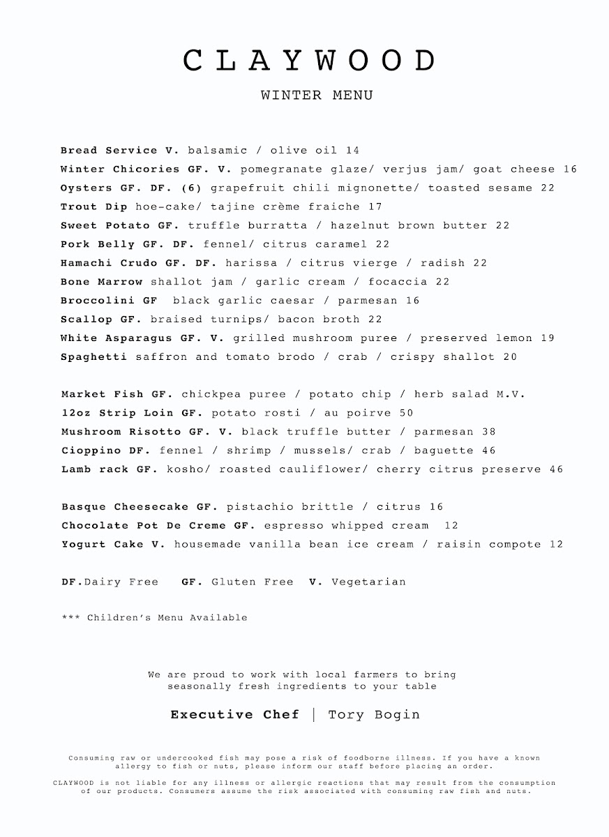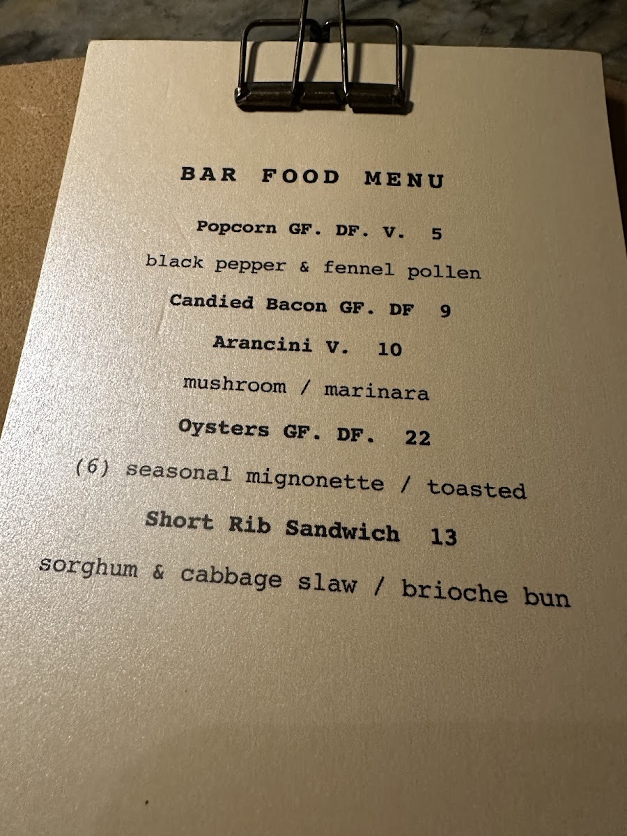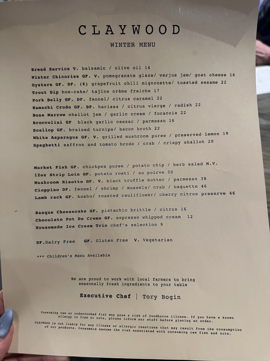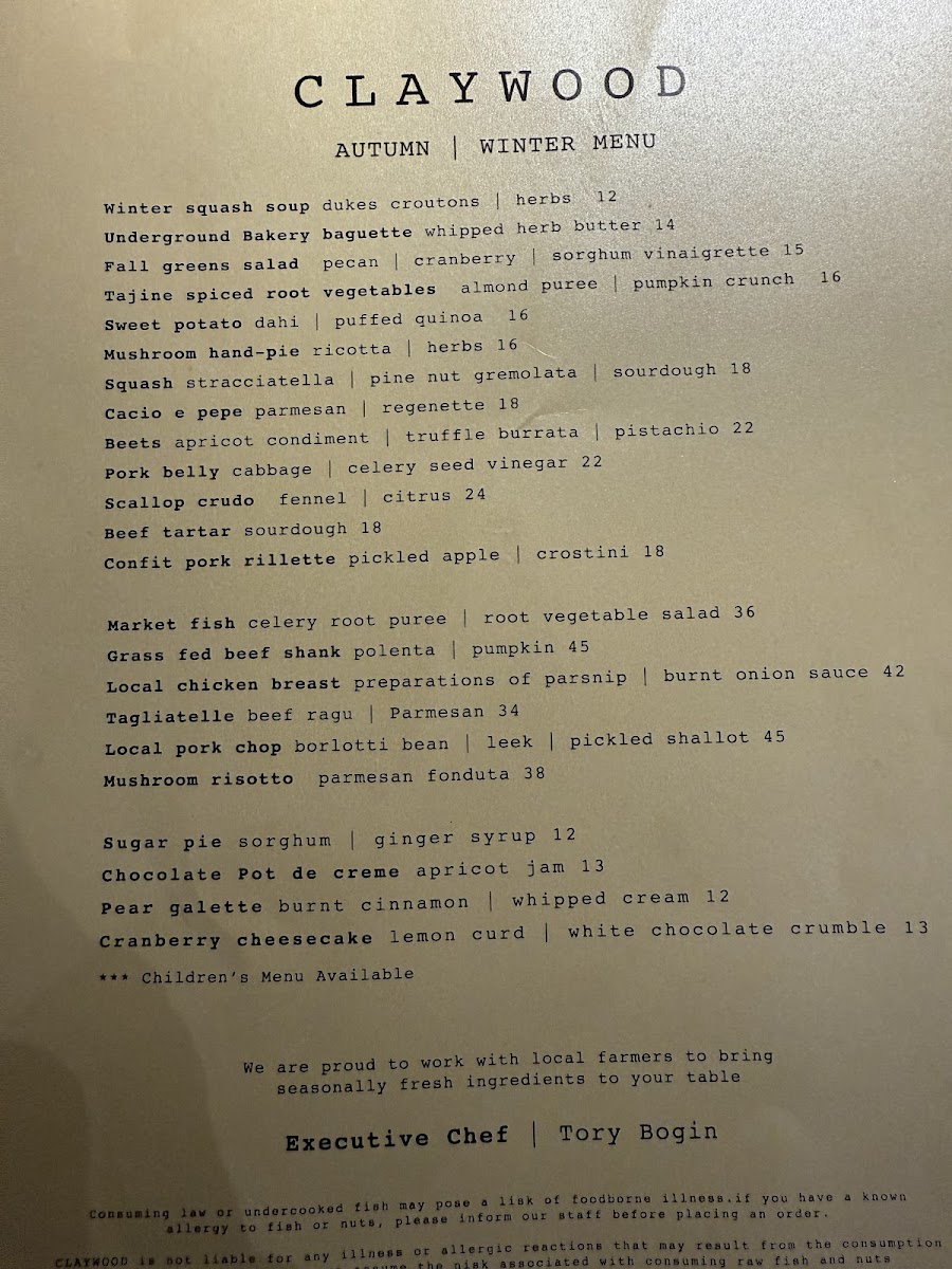 On the food side, the menu complements the drinks without overcomplicating things. The Bar Food Menu offers easygoing yet satisfying bites like Popcorn, Candied Bacon, Arancini, Oysters, and a hearty Short Rib Sandwich. Seasonal dishes such as the Fall Greens Salad reflect an autumnal focus, while other offerings-Bread Service, Winter Chicories, Oysters, Trout Dip, and Pork Belly-round out the experience with depth and comfort. Overall, the menu reads as a cohesive conclusion to the Claywood experience: polished but approachable, seasonal yet grounded, and clearly designed to leave a lasting impression.