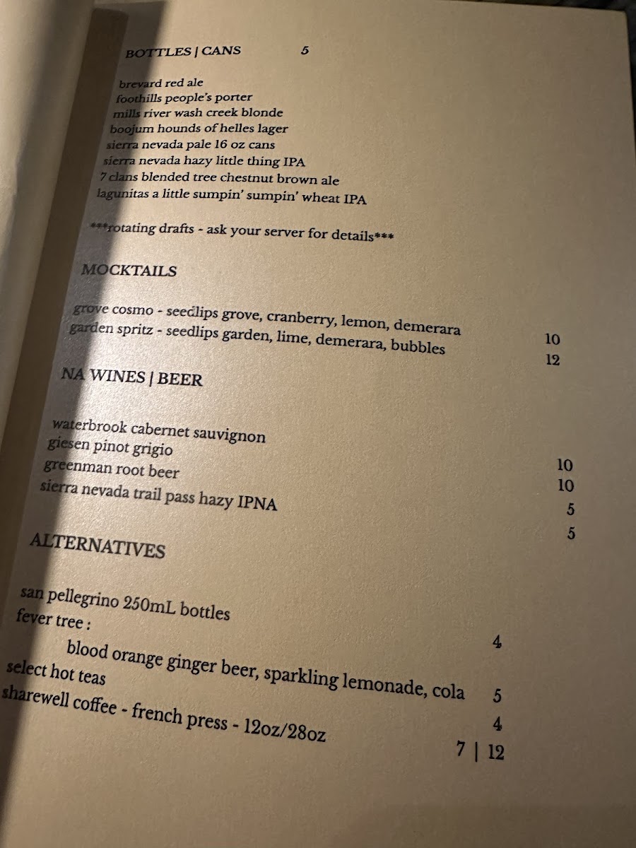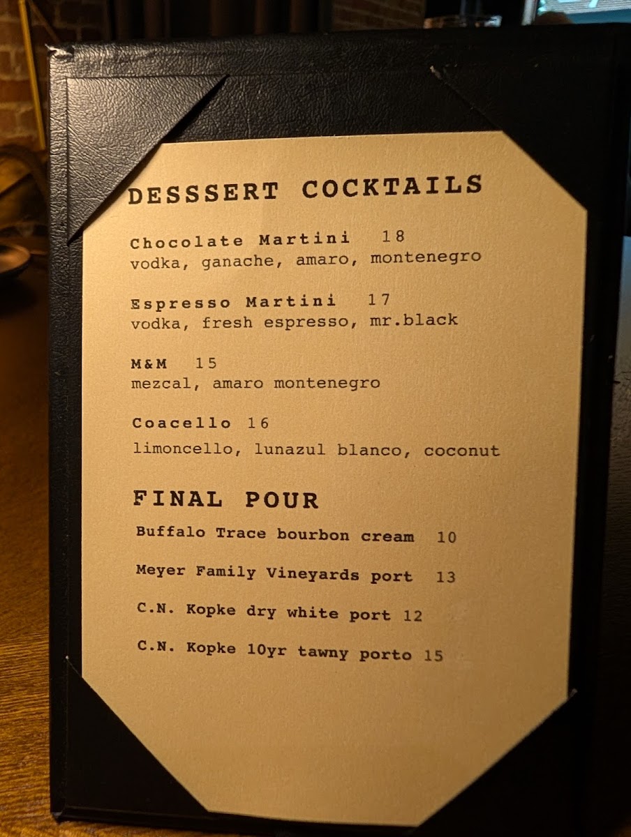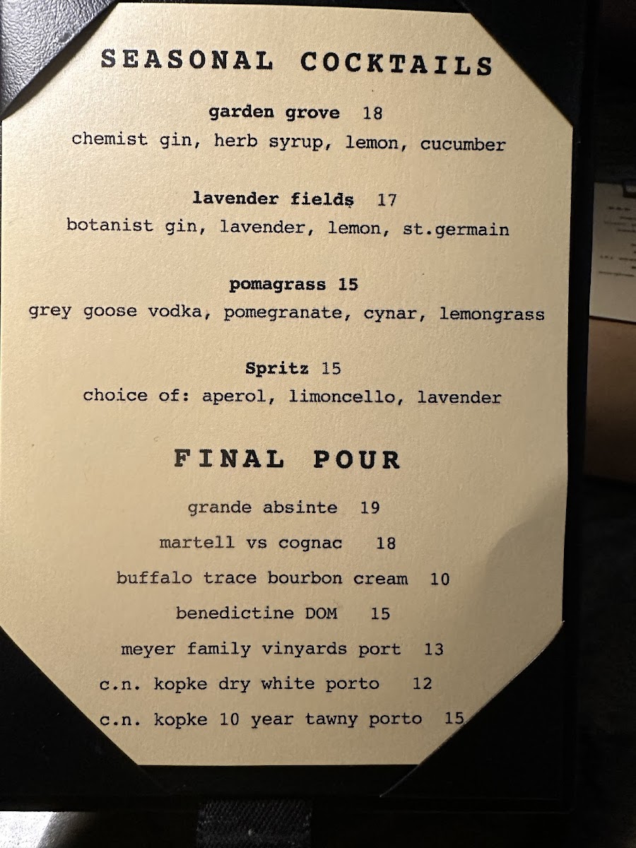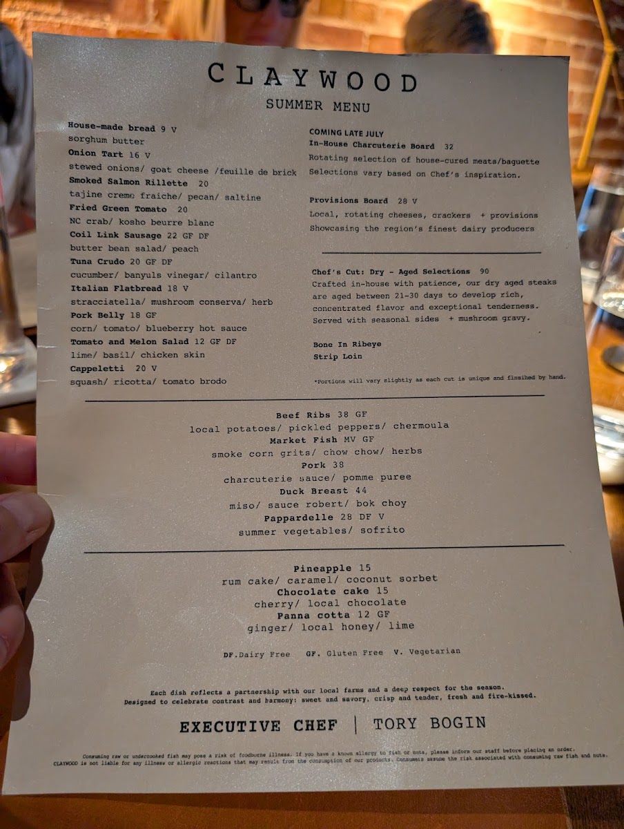 On the food side, the menu complements the drinks without overcomplicating things. The Bar Food Menu offers easygoing yet satisfying bites like Popcorn, Candied Bacon, Arancini, Oysters, and a hearty Short Rib Sandwich. Seasonal dishes such as the Fall Greens Salad reflect an autumnal focus, while other offerings-Bread Service, Winter Chicories, Oysters, Trout Dip, and Pork Belly-round out the experience with depth and comfort. Overall, the menu reads as a cohesive conclusion to the Claywood experience: polished but approachable, seasonal yet grounded, and clearly designed to leave a lasting impression.